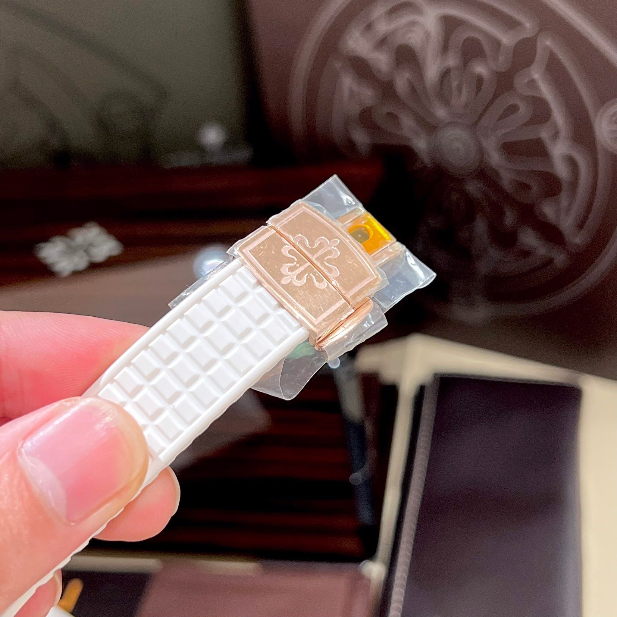 Dây đeo Patek Philippe Aquanaut 5068R-010 bằng chất liệu cao su cao cấp. Dây màu trắng thanh lịch, khóa gập bằng vàng hồng có khắc in biểu tượng hoa thị độc quyền bản hãng. Bên trong là cỗ máy tự động lên cót Caliber 324 SC. Đây là dòng máy cao cấp được hãng sử dụng phổ biến cho các model gồm 3 kim quay và một lịch ngày.